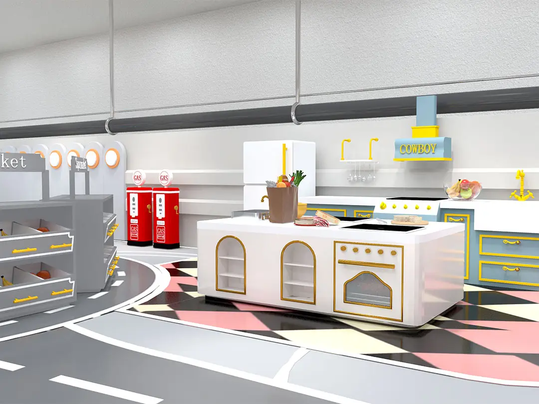 مناسبة للأطفال الذين تتراوح أعمارهم بين 2-5. There are all kinds of beautiful clothes in the cosplay dressing room. Children can dress up as their favorite cartoon characters or play professional roles in simulated Supermarkets, Princess House, Kitchen , Hospital ,Construction Zone , Fire Department , Gas Stations, Post Offices, Police Stations, وأكثر. Immersive props are used to stimulate children’s talent for performance. Allows children to fully play their imagination!