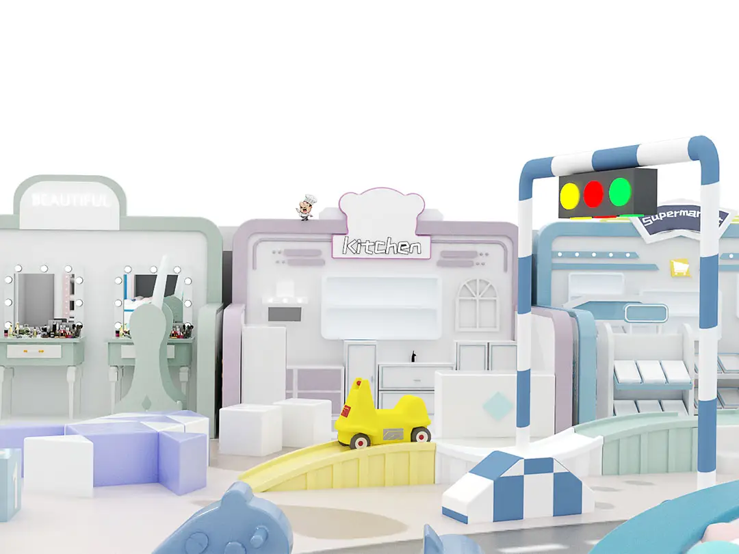 مناسبة للأطفال الذين تتراوح أعمارهم بين 2-5. There are all kinds of beautiful clothes in the cosplay dressing room. Children can dress up as their favorite cartoon characters or play professional roles in simulated Supermarkets, Princess House, Kitchen , Hospital ,Construction Zone , Fire Department , Gas Stations, Post Offices, Police Stations, وأكثر. Immersive props are used to stimulate children’s talent for performance. Allows children to fully play their imagination!