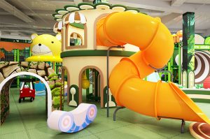Forest Zone: The indoor theme park project creates an immersive forest environment with extensive greenery, through animal elements such as lions, bears, monkeys, and tigers, which reinforces the forest atmosphere. This zone focuses on physical training, featuring trampolines, climbing nets, and climbing frames to enhance physical function, hand-foot coordination, and balance.